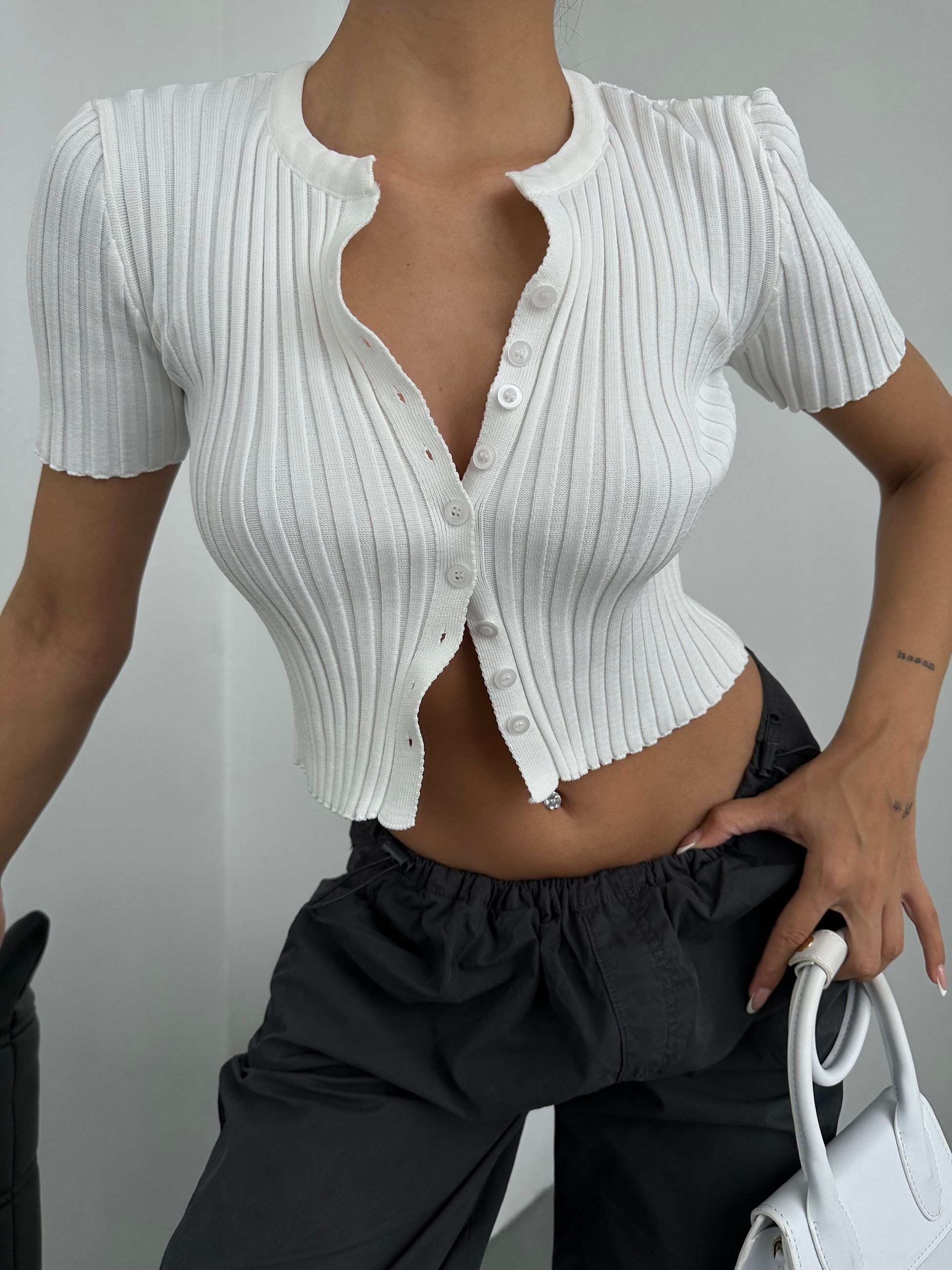 Bisiklet Yaka Düğmeli Fitilli Crop Triko Bluz